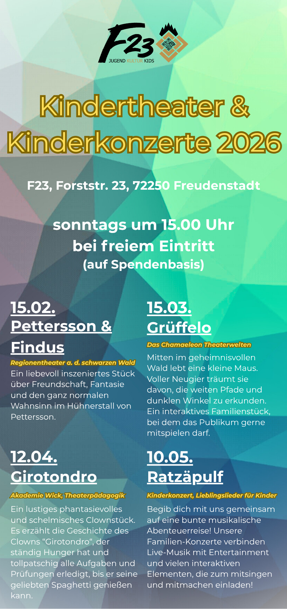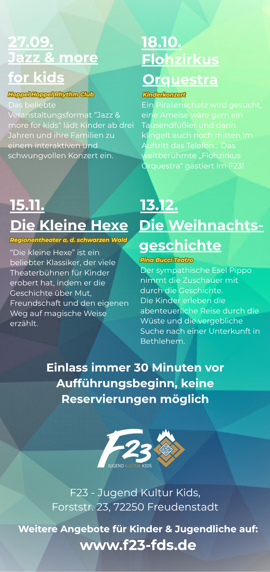 Der Kinderbereich des F23 bietet jeweils mittwochs bis freitags von 14.00 Uhr bis 16.30 Uhr ein offenes und kostenloses Angebot für Grundschulkinder an. Die Kinder können unter Anleitung Malen, Spielen, Basteln, Toben u.v.m.