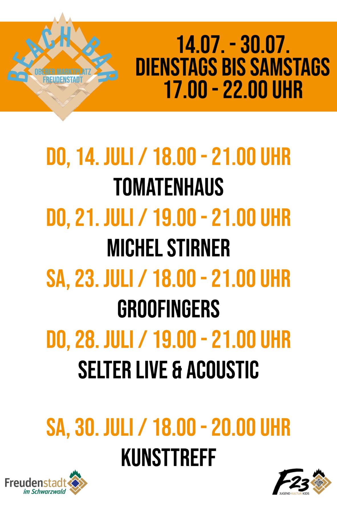 Vom 14.07. bis 30.07. hat die Beach Bar am oberen Marktplatz dienstags bis samstags 17.00 - 22.00 Uhr geöffent. Hier gibt's kühle Getränke, Loungemusic und Liegestühle in einer entspannten Atmosphäre. Kommt vorebi und genießt die Zeit am Beach!