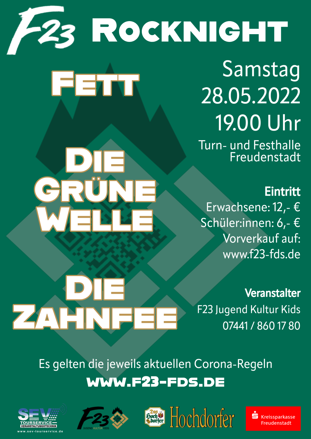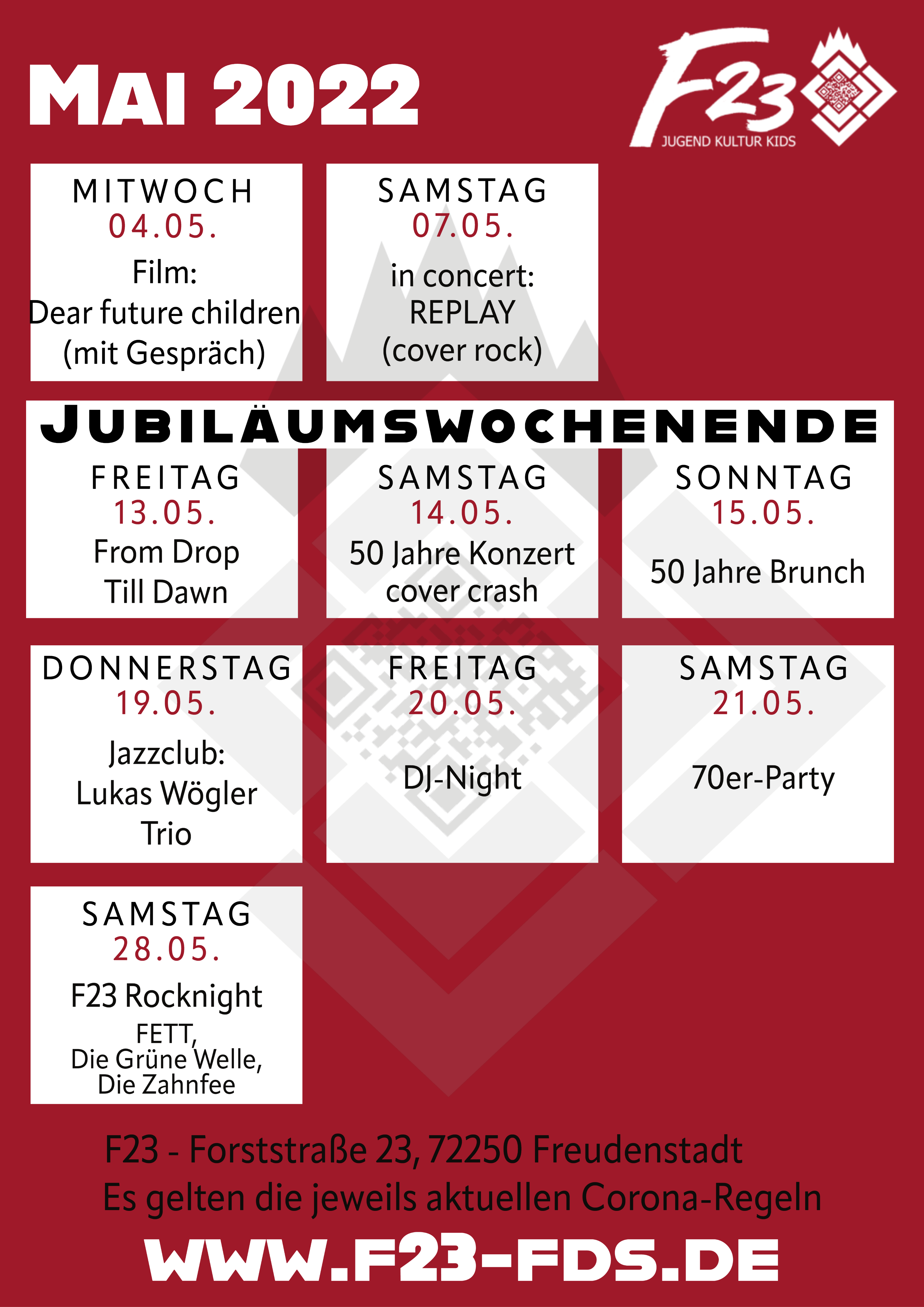 Nach zweijähriger Pause wird es dann im Mai erstmals wieder Livemusik im neuen F23-Club geben. Hochkarätige Coverbands versprechen zum Jubiläum rockige Zeitreisen durch die Musik der letzten Jahrzehnte. Der eindrückliche Dokumentarfilm "Dear Future Children" eröffnet Einblicke in das Leben drei junger Aktivistinnen aus Hongkong, Uganda und Chile. Die 70er Jahre Party beamt uns zurück in die Anfangszeiten der Forststraße 23. Die DJ-Night mit „From Drop Til Dawn“ lässt uns tanzen. „It Might Get Loud“ heißt die Devise auf der F23-Rocknight in der Turn- und Festhalle mit den Bands FETT, Die Grüne Welle und Die Zahnfee. In Kooperation mit der Musik- und Kunstschule zeigen wir die Ausstellung „Wie wir euch sehen“-Jugendliche porträtieren Landtagsabgeordnete. In einer Dauerausstellung mit Fotos und Plakaten aus den letzten 50 Jahren präsentiert sich das F23 außerdem erstmals als Galerie. Zu einem sonntäglichen Brunch öffnet das F23 seine Pforten für alle Freudenstädter.