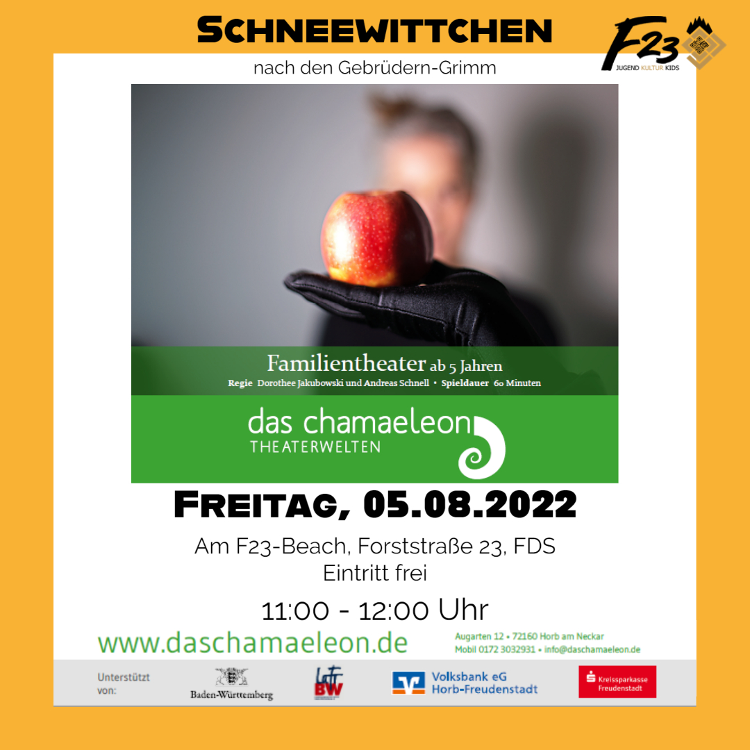 Ein besonderes Highlight in diesem Jahr ist sicherlich das Kindertheaterstück „Schneewittchen“ mit dem Theater „das chamaeleon – THEATERWELTEN“ aus Horb, das am Freitag, 5. August um 11 Uhr auf dem „F23 Beach“ in der Forststraße 23 (früher Kinder- und Jugendzentrum, gegenüber vom Stadtbahnhof in Freudenstadt) aufgeführt wird. Auf dem „F23 Beach“ gibt es dann im Rahmen des Sommerferienprogramms noch weitere Sonderveranstaltungen wie z.B. einen zweitägigen Clown Workshop. Auch das Spielmobil des Kinder- und Jugendreferates ist wieder in Freudenstadt und den Teilorten unterwegs und auch die beliebten Kinderspielzeugflohmärkte auf dem Oberen Marktplatz in Freudenstadt wird es nach einer Pandemie bedingten zweijährigen Pause nun endlich wieder geben.