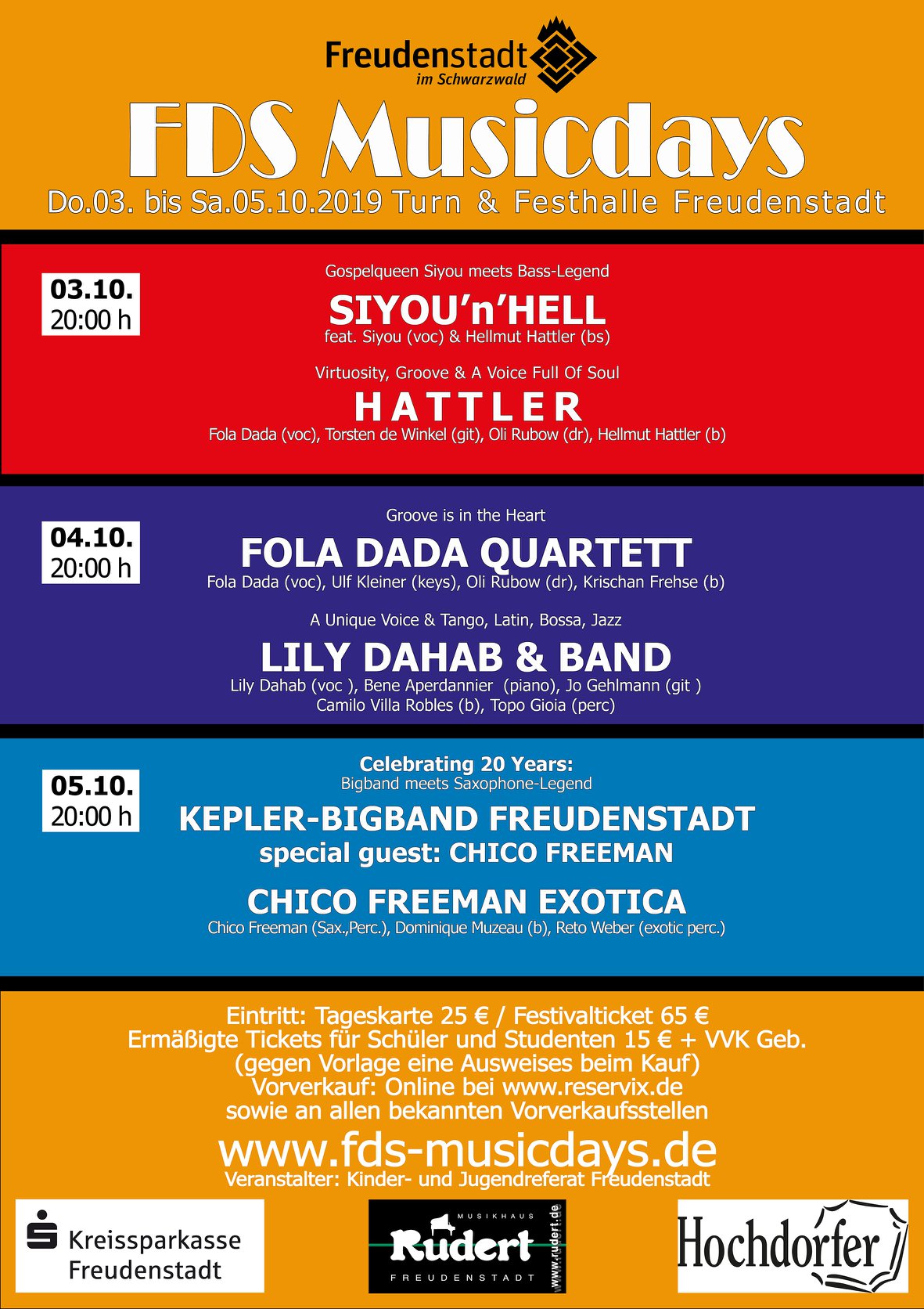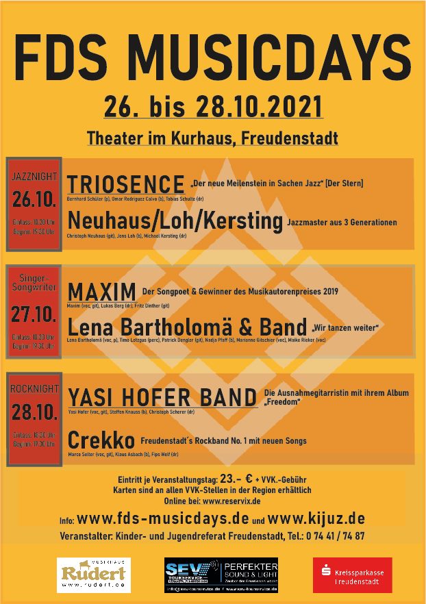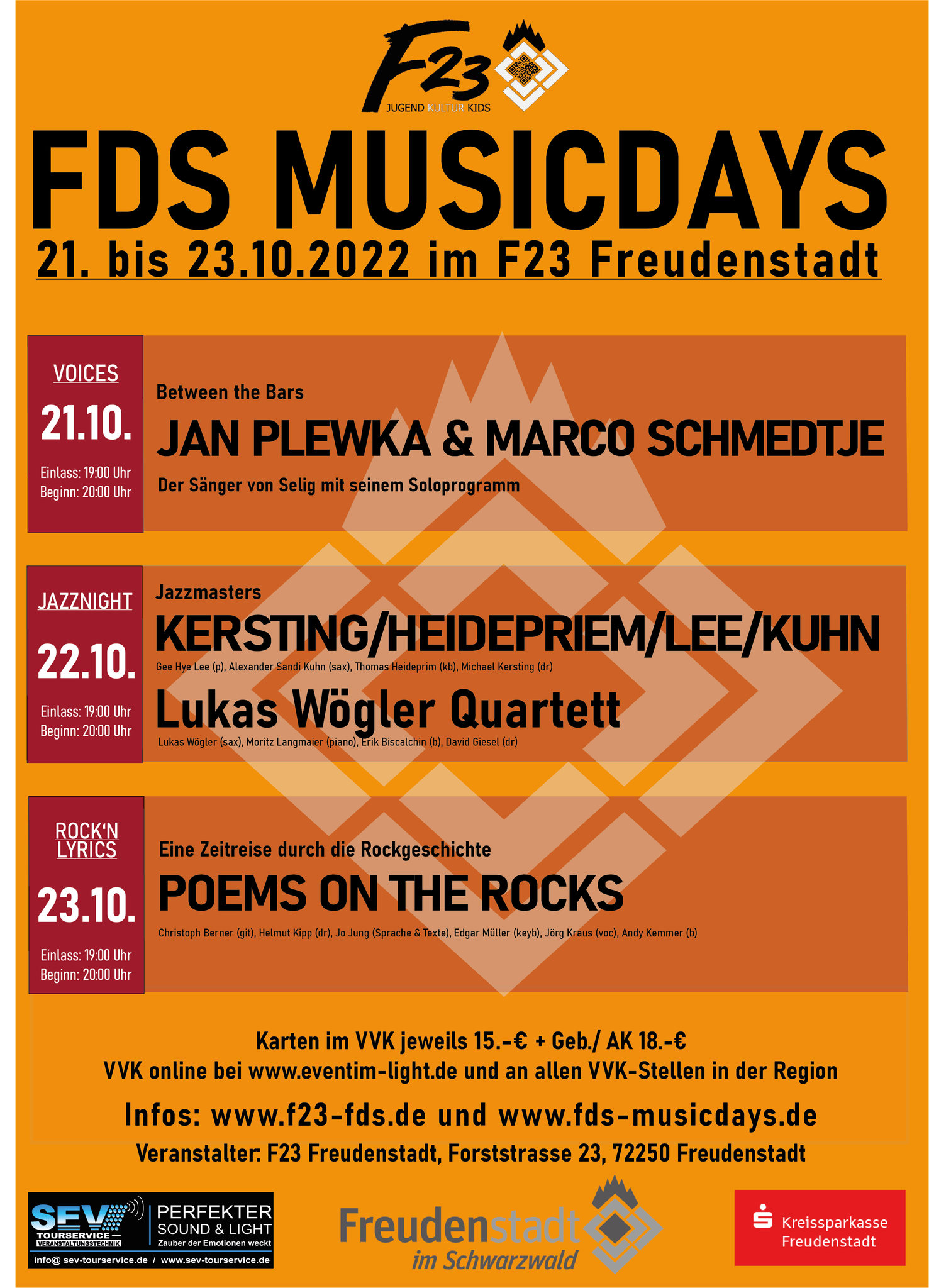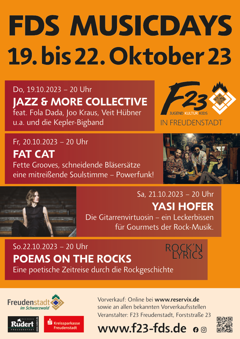 Die Konzerte beginnen jeweils um 20 Uhr. Alle Informationen zum Festival finden sich auf www.f23-fds.de Karten gibt es im VVK bei www.reservix.de oder in den jeweiligen Venues bzw. über deren Webseiten.