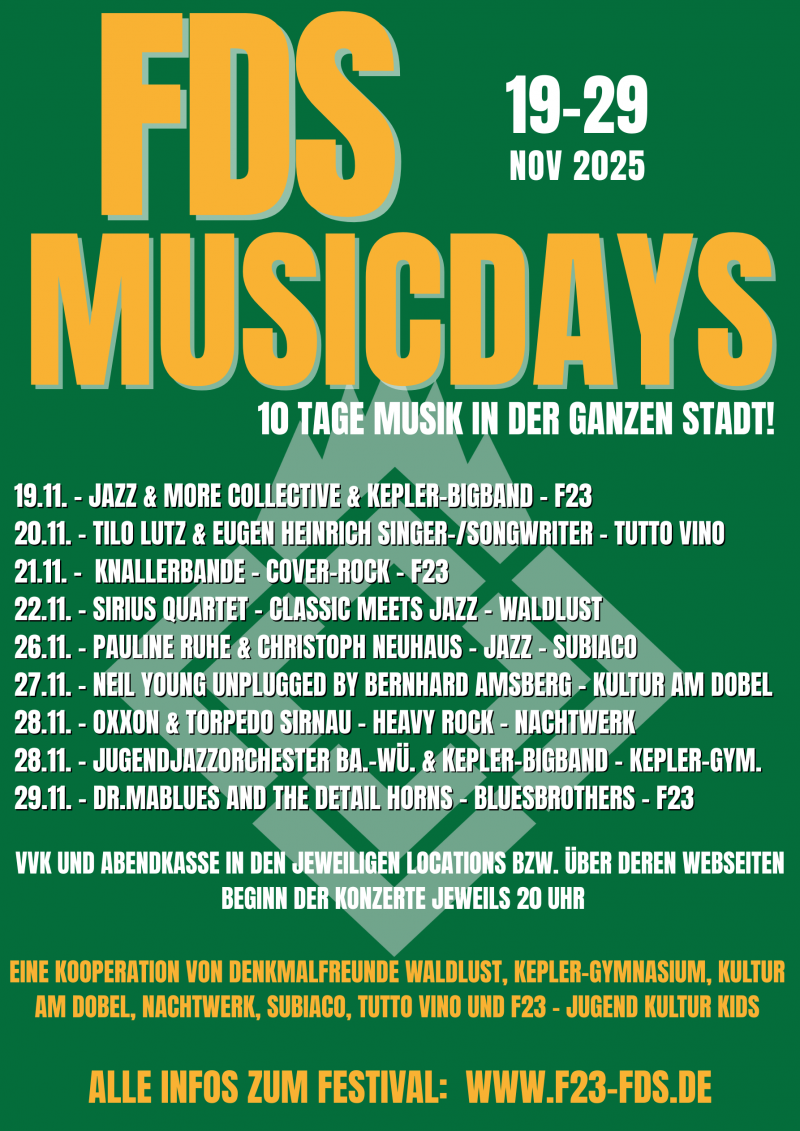 Eröffnet wird das Festival am 19.11. vom Jazz & More Collektive und der Kepler-Bigband im F23 mit viel Groove. Am 20.11. singen Tilo Lutz & Eugen Heinrich eigene Songs und Covers im intimen Ambiente des Tutto Vino. Die Knallerbande aus Sindelfingen lädt am 21.11. zur Cover-Rock-Party ins F23. Bei den Virtuosen des Sirius Quartet aus New York trifft am 22.11. Klassik auf Jazz. Am 26.11. lädt das Subiaco Kino zum Sofa-Konzert mit der charismatischen Jazzsängerin Pauline Ruhe und dem Gitarrenvirtuosen Christoph Neuhaus. Am 27.11. präsentiert Kultur am Dobel "Neil Young unplugged" von Bernhard Amsberg. Am 28.11. rocken Oxxon & Torpedo Sirnau im Nachtwerk frei nach dem Motto "It might get loud". Ebenfalls am 28.11. spielt das Jugendjazzorchester Baden-Württemberg unter der Leitung von Klaus Graf im Kepler-Gymnasium. Eröffnet wird der Abend von der Kepler-Bigband. Zur Abschlussparty der FDS Musicdays laden am 29.11. die Bluesbrothers von Dr. Mablues and the detail Horns ins F23.
