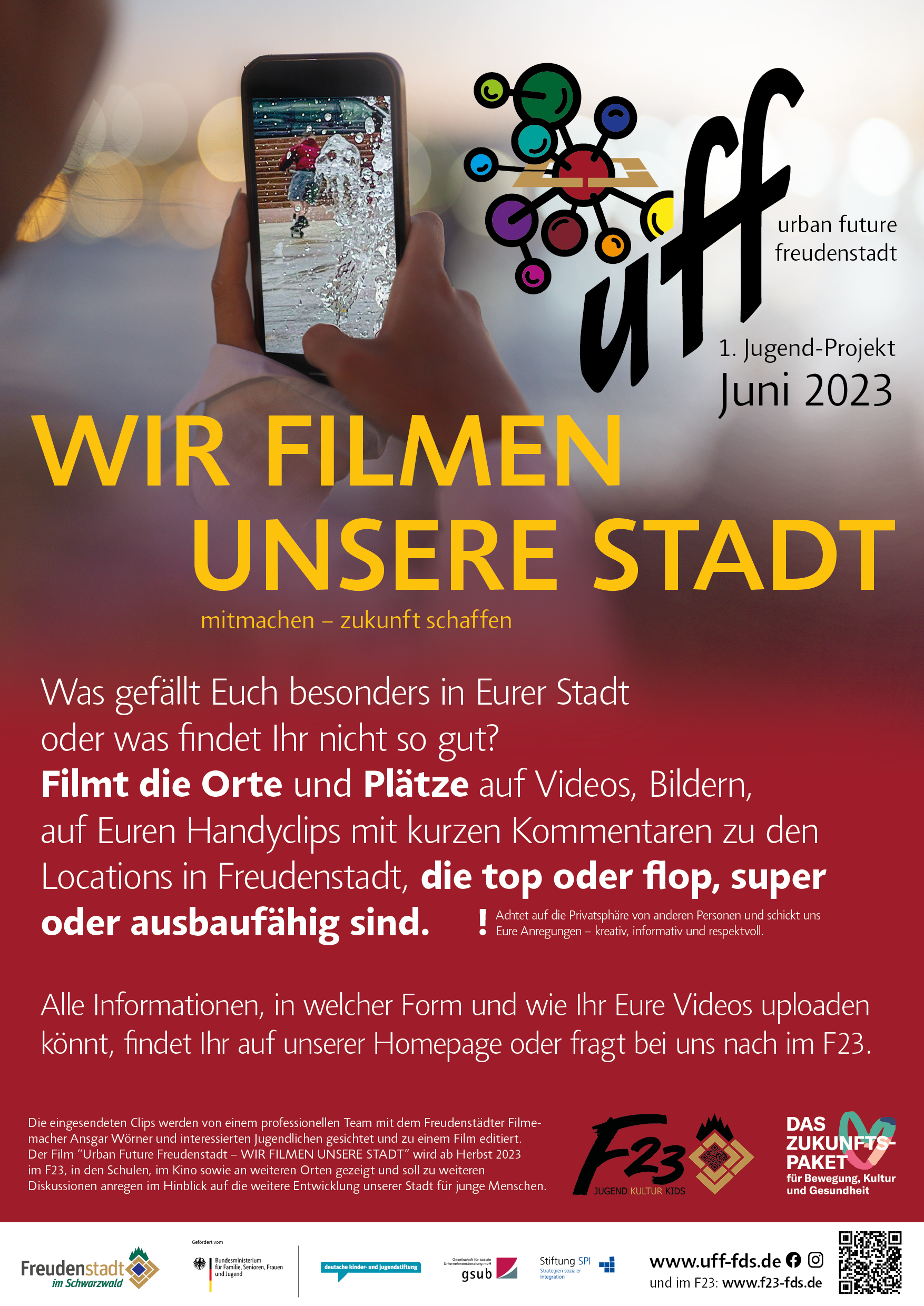 Um eine möglichst rege Beteiligung an dem Filmprojekt zu erreichen, wird das Projekt auf allen Kanälen beworben werden. Du kannst uns dabei unterstützen, indem Du Deinen Freunden davon erzählst. Ihr habt bis Ende September Zeit. Die eingesendeten Clips werden dann vom Freudenstädter Filmemacher Ansgar Wörner zusammen mit interessierten Jugendlichen gesichtet und zu einem Film editiert. Er soll die Sicht der Freudenstädter Jugend auf ihre Stadt vermitteln. Wenn ihr Lust habt daran mitzuarbeiten, dann meldet Euch bitte unter