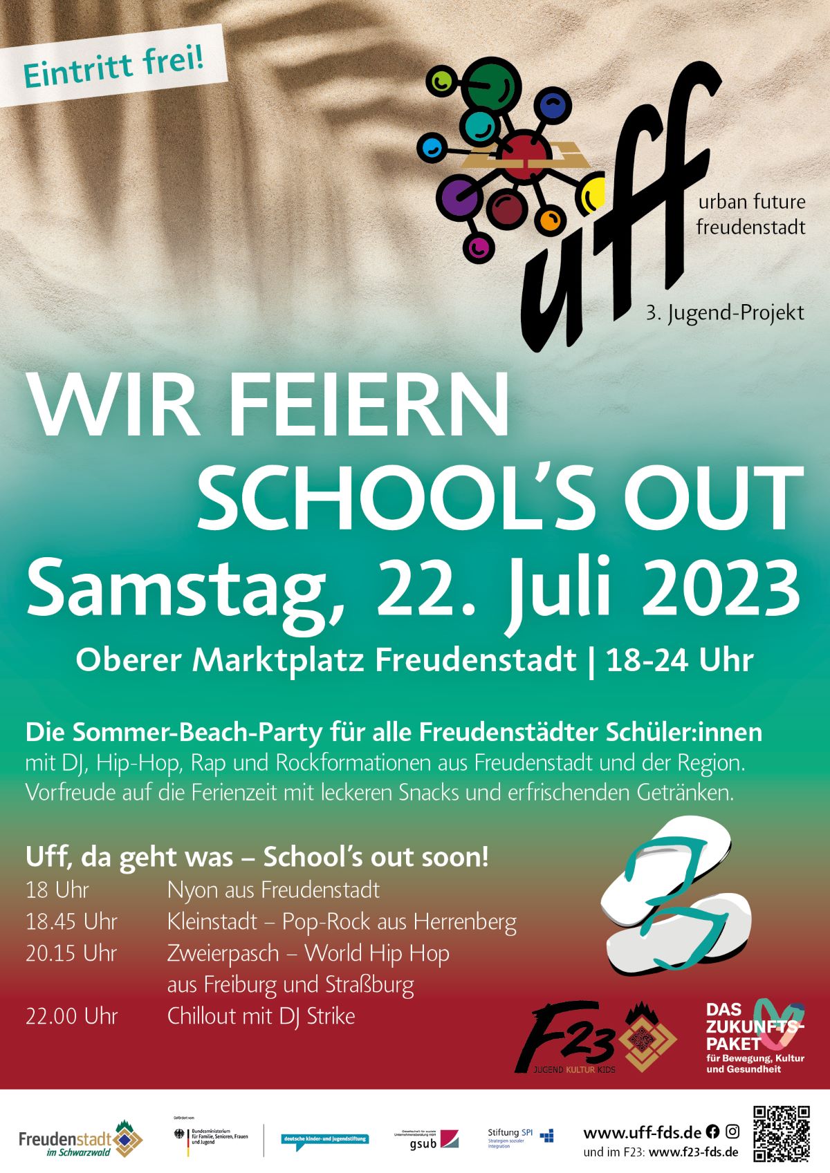 Kurz vor Beginn der Sommerferien wird erstmals ein Fest für alle Freudenstädter Schüler auf dem oberen Marktplatz in Freudenstadt stattfinden. Das Team des F23 organisiert mit und für Jugendliche eine Bühne, die notwendige Technik und das Programm. DJ‘, Hip Hop, Rap und Rockformationen aus Freudenstadt und der Region sorgen für gute Stimmung. Auf dem Marktplatz-Beach und an weiteren Ständen gibt Essen und Getränke. Der Eintritt ist frei.
