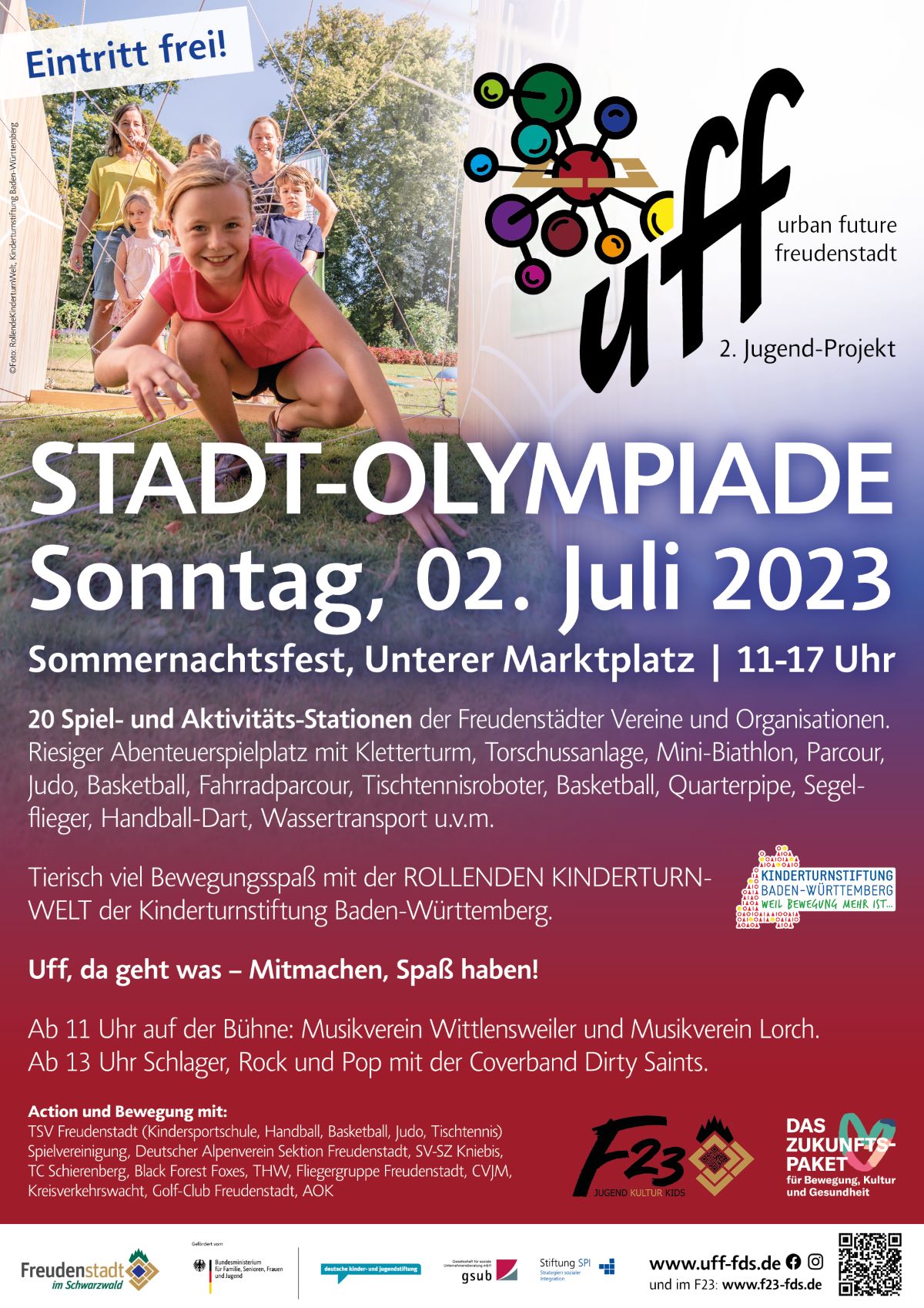 Im Rahmen des Sommernachtsfestes findet am Sonntag erstmal die Stadtolympiade statt. Das Team des F23 Freudenstadt organisierte in Kooperation mit dem TSV Freudenstadt und Ex-Stadtrat Günter Braun 20 Spiel- und Aktivitätsstationen, die von verschiedenen Freudenstädter Vereinen und Organisationen betreut werden. Der untere Marktplatz wird in einen riesigen Abenteuerspielplatz für Jung und Alt verwandelt werden. Auch für die Kleinsten wird mit Unterstützung der Kinderturnstiftung eine Kinderturnwelt aufgebaut. Von der Kletterwand, über einen Fahrradparcours bis zu Handballdart laden die einzelnen Stationen zum Mitmachen ein. Wer alle möglichen Punkte an den Stationen gesammelt hat, erhält zum Schluss eine Auszeichnung. Auf der großen Bühne spielen ab 11 Uhr zunächst der Musikverein Wittlensweiler und dann die Gäste des Musikvereins Lorch. Ab 13 Uhr unterhalten dann die Dirty Saints mit Schlager, Rock und Pop. Bei der Stadtolympiade stehen der Spaß am Spiel und das Miteinander der Generationen im Mittelpunkt. Eröffnet wird der Tag um 10 Uhr mit einem ökumenischen Gottesdienst.